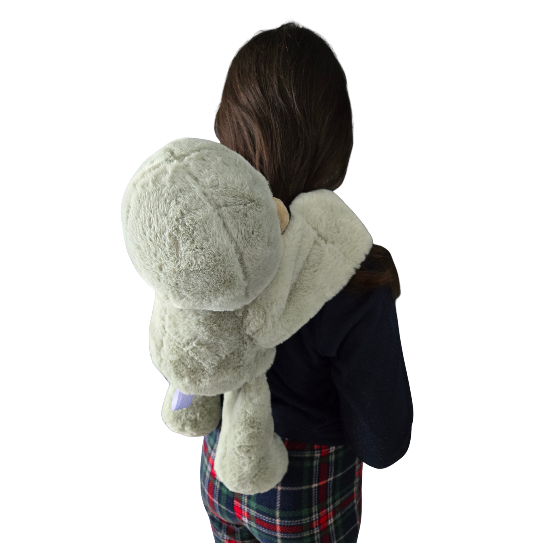 Avec ses grands bras tout doux, Maurice aime se déposer autour du cou pour offrir une présence rassurante et un moment de pause quand la journée devient un peu trop chargée.